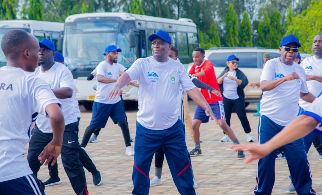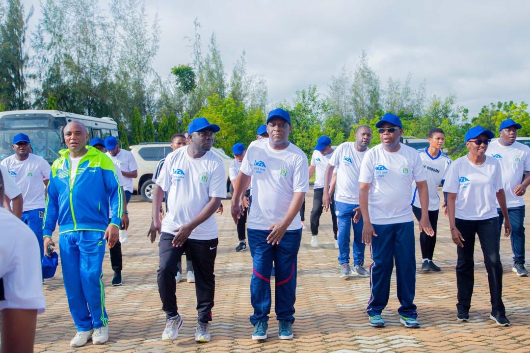 Naibu Katibu Mkuu (Mazingira) Ofisi ya Makamu wa Rais Balozi Baraka Luvanda (katikati) akiongoza mazoezi ya viungo katika kuadhimisha Siku ya Jumuiya ya Nchi za Ukanda wa Bahari ya Hindi (IORA) katika Ofisi za Mambo ya Nje na Ushirikiano wa Afrika Mashariki Mtumba jijini Dodoma.