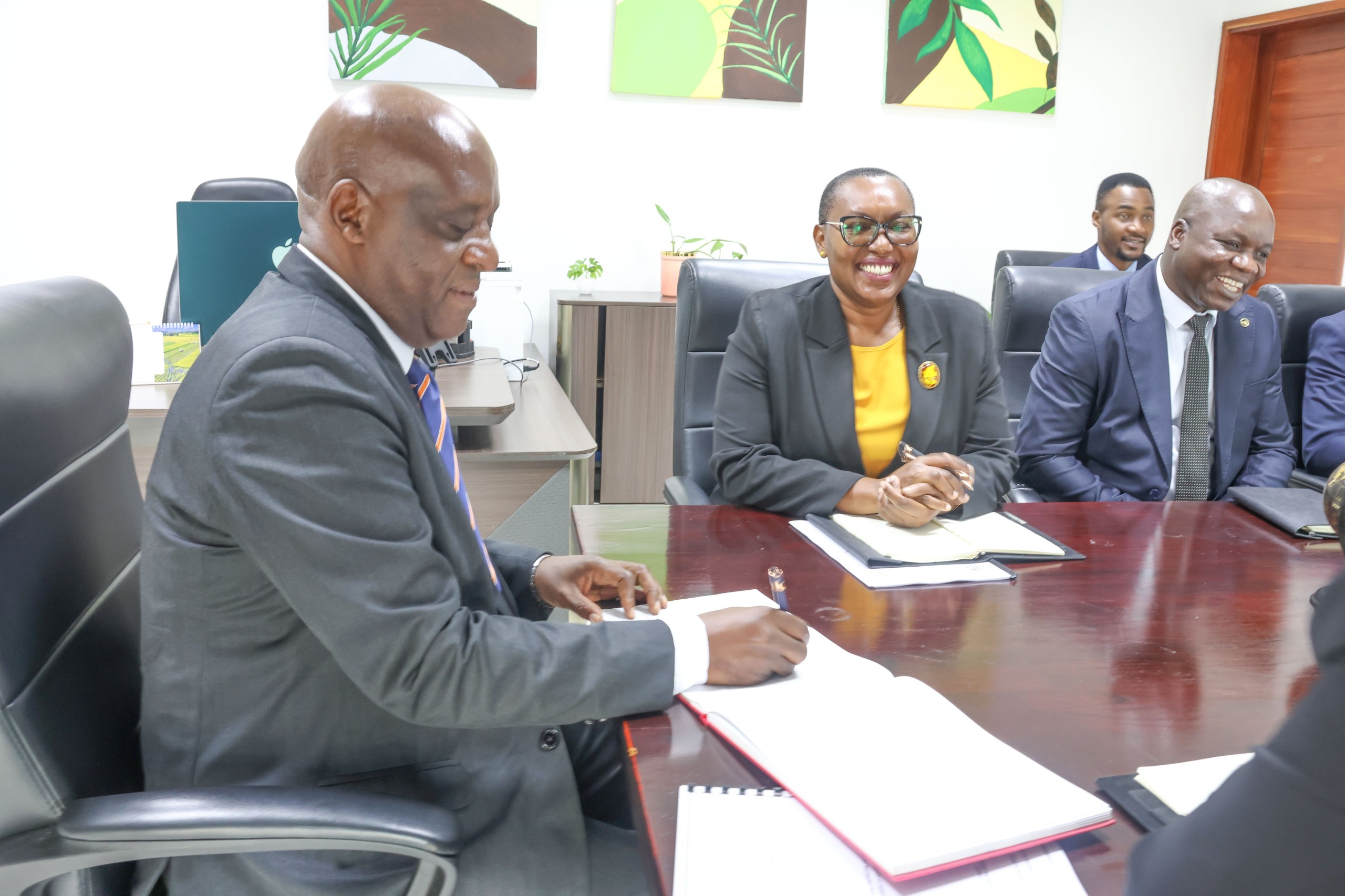 Naibu Katibu Mkuu (Mazingira) Ofisi ya Makamu wa Rais, Mhe. Balozi Baraka Luvanda akisaini kitabu cha wageni muda mfupi baada ya kuwasili katika Ofisi za Baraza la Taifa la Hifadhi na Usimamizi wa Mazingira (NEMC) Jijini Dar es Salaam leo Alhamisi Machi 05, 2026 kuanza ziara yake ya kikazi. Anayeshuhudia ni Mkurugenzi Mkuu wa NEMC, Dkt. Immaculate Sware