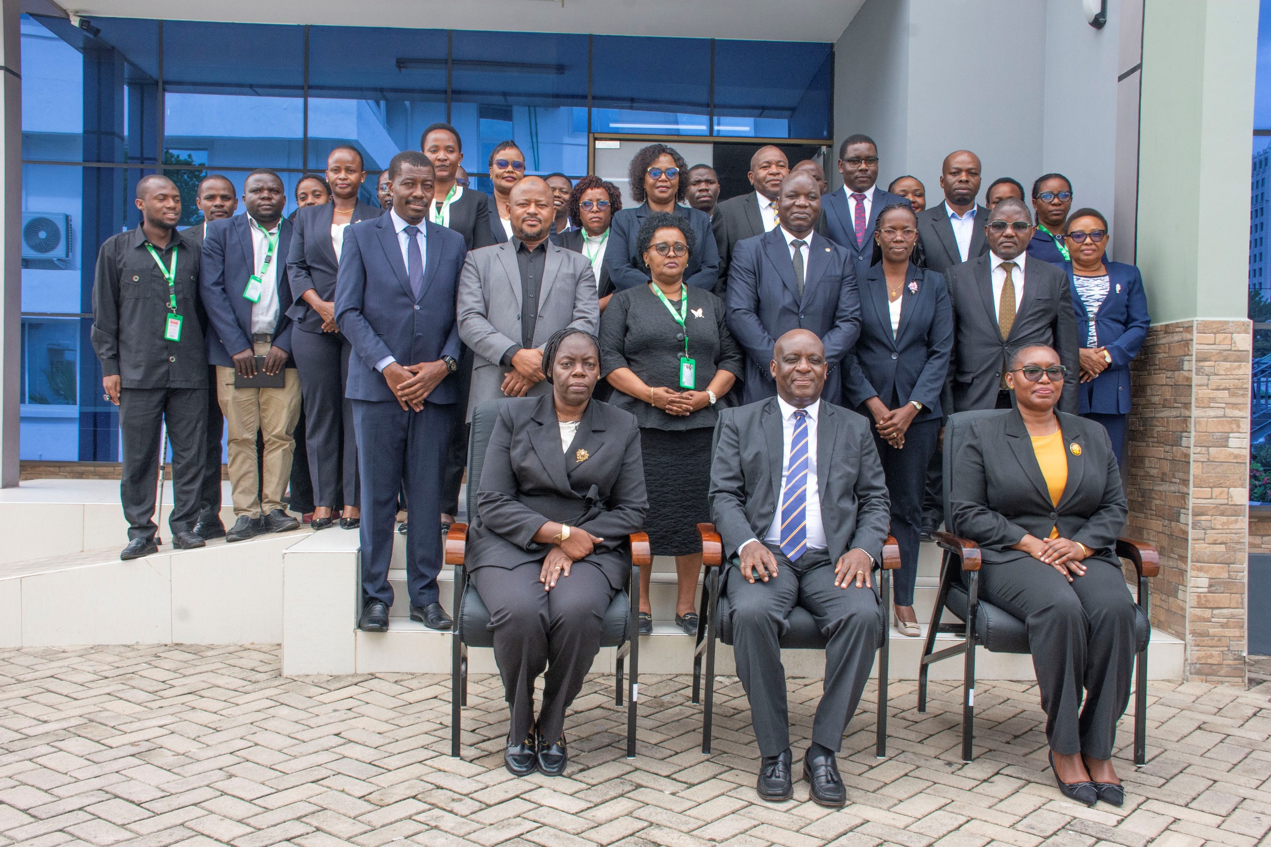 Naibu Katibu Mkuu (Mazingira) Ofisi ya Makamu wa Rais, Mhe. Balozi Baraka Luvanda (katikati) akiwa katika picha ya pamoja na Mkurugenzi Mkuu wa Baraza la Taifa la Hifadhi na Usimamizi wa Mazingira (NEMC), Dkt. Immaculate Sware (kulia) na Mkurugenzi wa Mazingira Ofisi ya Makamu wa Rais, Bi. Kemilembe Mutasa (kushoto) pamoja na watendaji wengine wa Baraza hilo muda mfupi baada ya kumaliza ziara yake aliyoifanya katika Ofisi za Baraza hilo leo Alhamisi Machi 05, 2026.