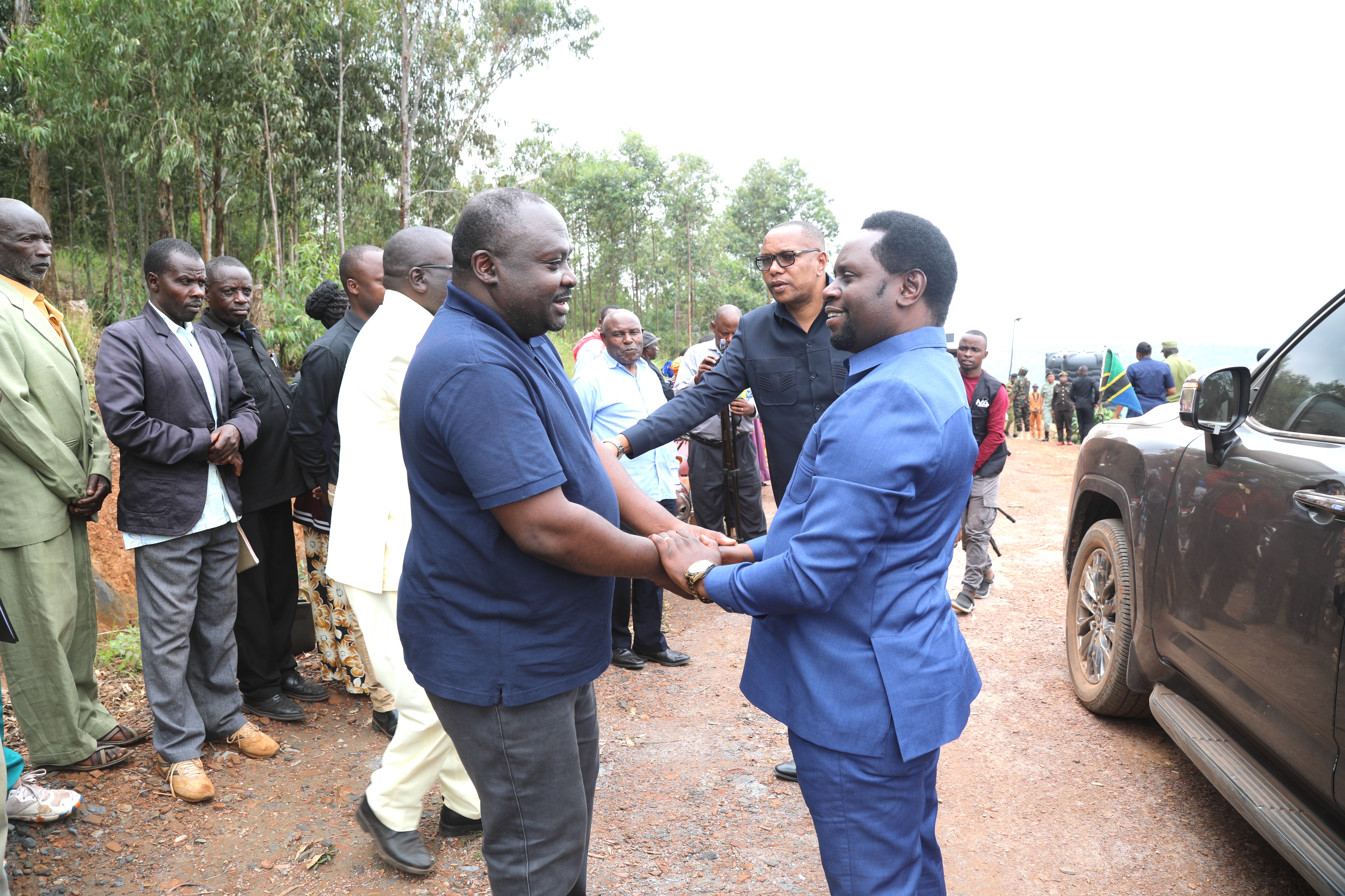 Naibu Waziri Ofisi ya Makamu wa Rais (Muungano na Mazingira) Mhe. Dkt. Festo Dugange akisalimiana na Katibu Mtendaji wa Kampuni ya KADERES Bw. Leonard Faustine alipowasili kwenye mradi kilimo mseto (Kinoni Agroforestry Farm) unaotekelezwa na Kampuni ya KADERES, katika Wilaya ya Karagwe mkoani Kagera.