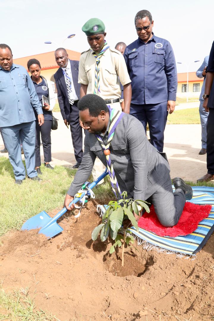 Naibu Waziri Ofisi ya Makamu wa Rais (Muungano na Mazingira) Mhe. Dkt. Festo Dugange akipanda mti katika eneo la Chuo cha Mamlaka ya Elimu na Mafunzo Stadi (VETA) kilichopo Burugo wilayani Bukoba mkoani Kagera, alipofanya ziara chuoni hapo ya kuhimiza taasisi za umma kutumia nishati safi ya kupikia.