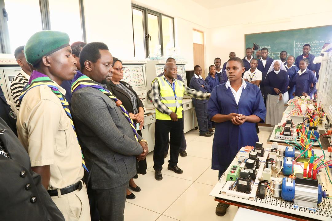 Naibu Waziri Ofisi ya Makamu wa Rais (Muungano na Mazingira) Mhe. Dkt. Festo Dugange akitembelea karakana ya umeme ya Chuo cha Mamlaka ya Elimu na Mafunzo Stadi (VETA) kilichopo Burugo wilayani Bukoba mkoani Kagera, ambayo ni ziara ya kuhimiza taasisi za umma kutumia nishati safi ya kupikia.