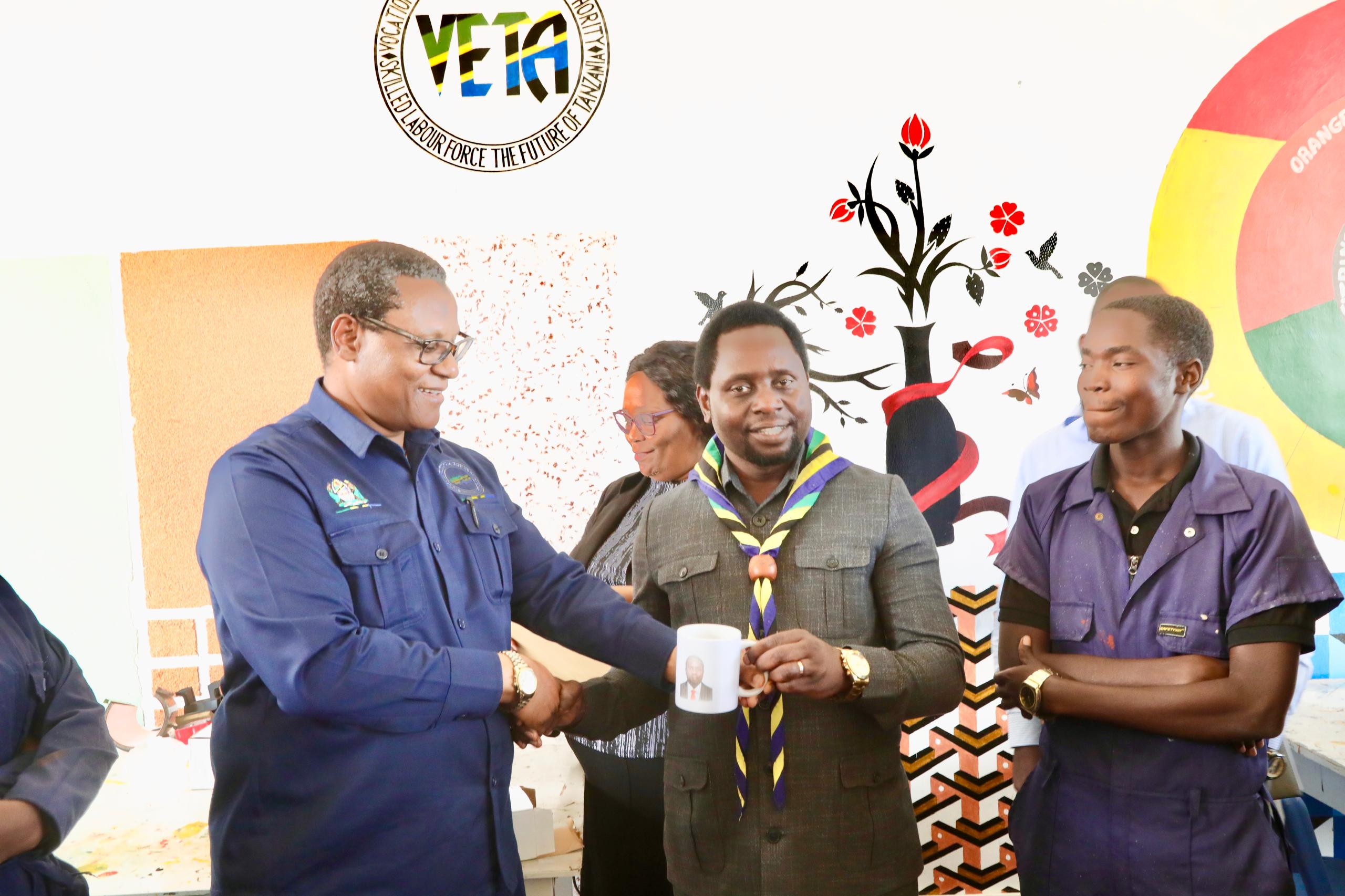 Naibu Waziri Ofisi ya Makamu wa Rais (Muungano na Mazingira) Mhe. Dkt. Festo Dugange akipokea zawadi ya kikombe chenye picha yake kilichoandaliwa katika karakana ya uchoraji na upakaji rangi alipotembelea Chuo cha Mamlaka ya Elimu na Mafunzo Stadi (VETA) kilichopo Burugo wilayani Bukoba mkoani Kagera, ambayo ni ziara ya kuhimiza taasisi za umma kutumia nishati safi ya kupikia.