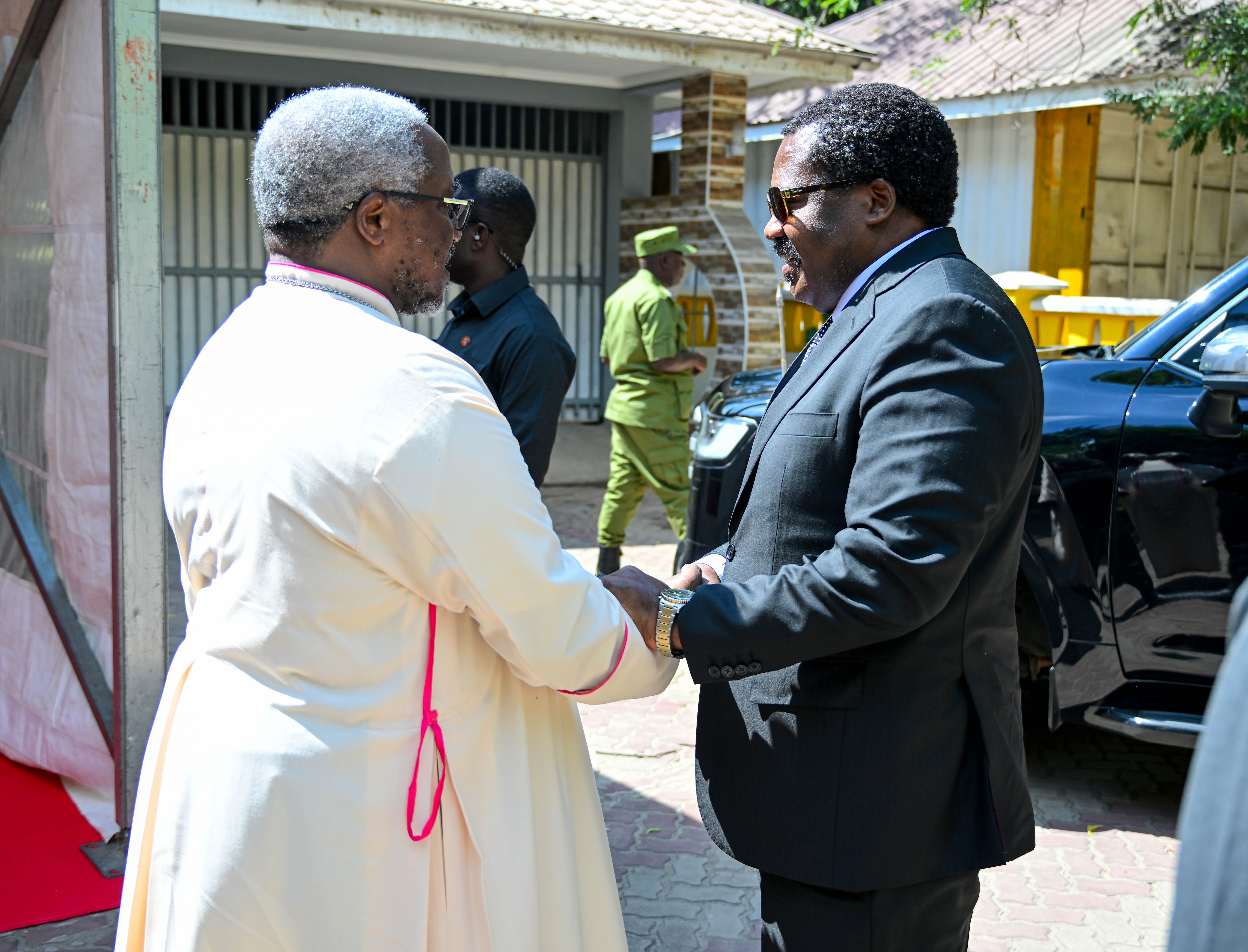 Makamu wa Rais wa Jamhuri ya Muungano wa Tanzania Mhe.Balozi Dkt. Emmanuel Nchimbi akisalimiana na Askofu Mkuu wa Jimbo Kuu Katoliki Dar es Salaam, Mhashamu Askofu Yude Thaddeus Ruwa’ich (OFM Cap) wakati alipowasili makazi ya Kiaskofu ya Jimbo Kuu Katoliki Dar es Salaam, Kurasini, kuwasilisha salamu za rambirambi za Rais wa Jamhuri ya Muungano wa Tanzania Mhe. Dkt. Samia Suluhu Hassan kufuatia kifo cha Askofu Mkuu Mstaafu wa Jimbo Kuu Katoliki Dar es Salaam, Mwadhama Polycarp Kardinali Pengo.