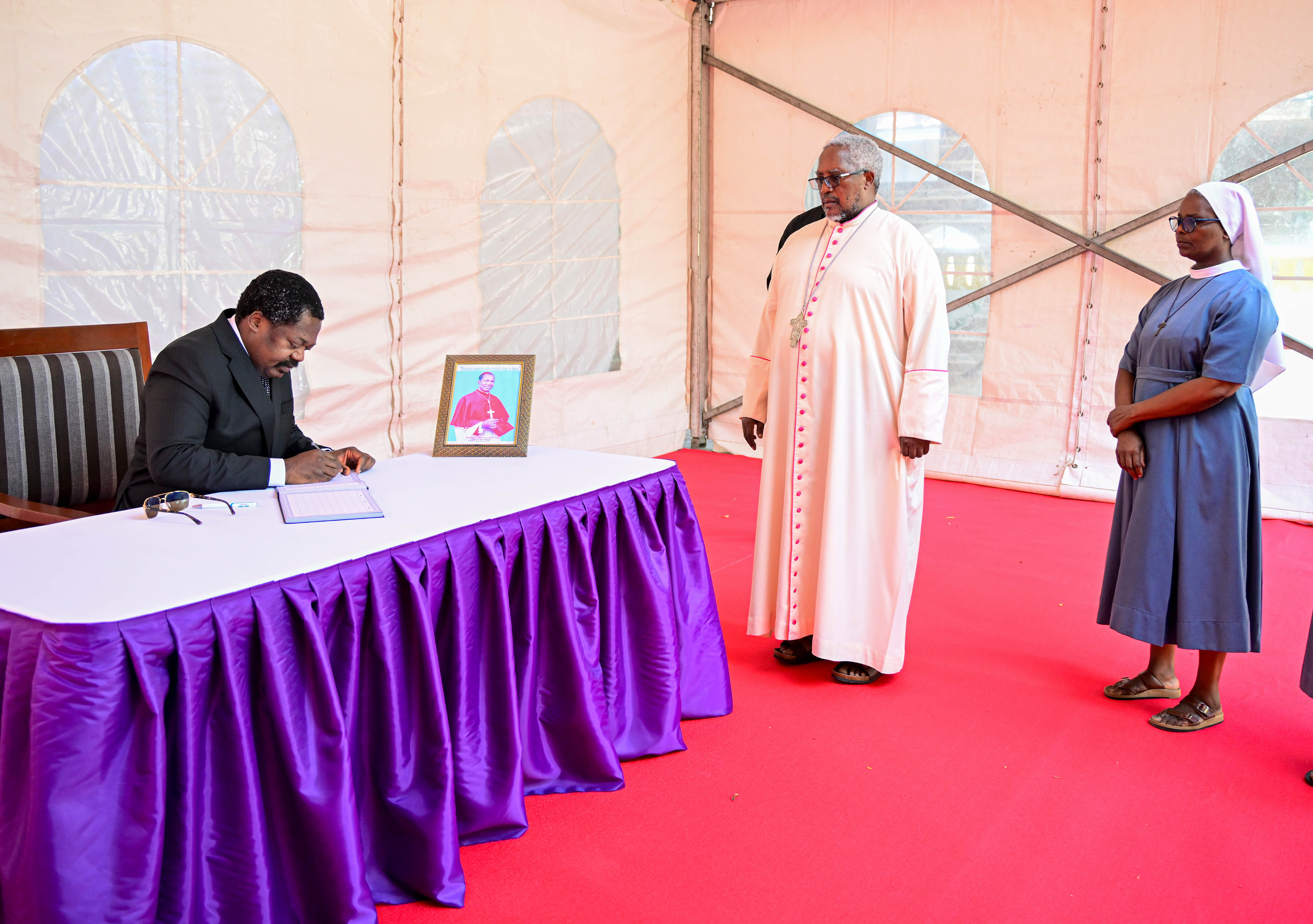Makamu wa Rais wa Jamhuri ya Muungano wa Tanzania Mhe.Balozi Dkt. Emmanuel Nchimbi akisaini kitabu cha maombolezo kufuatia kifo cha Askofu Mkuu Mstaafu wa Jimbo Kuu Katoliki Dar es Salaam, Mwadhama Polycarp Kardinali Pengo, wakati alipowasili makazi ya Kiaskofu ya Jimbo Kuu Katoliki Dar es Salaam, Kurasini, kuwasilisha salamu za rambirambi za Rais wa Jamhuri ya Muungano wa Tanzania Mhe. Dkt. Samia Suluhu Hassan kufuatia kifo cha Askofu Mkuu Mstaafu wa Jimbo Kuu Katoliki Dar es Salaam, Mwadhama Polycarp Kardinali Pengo.