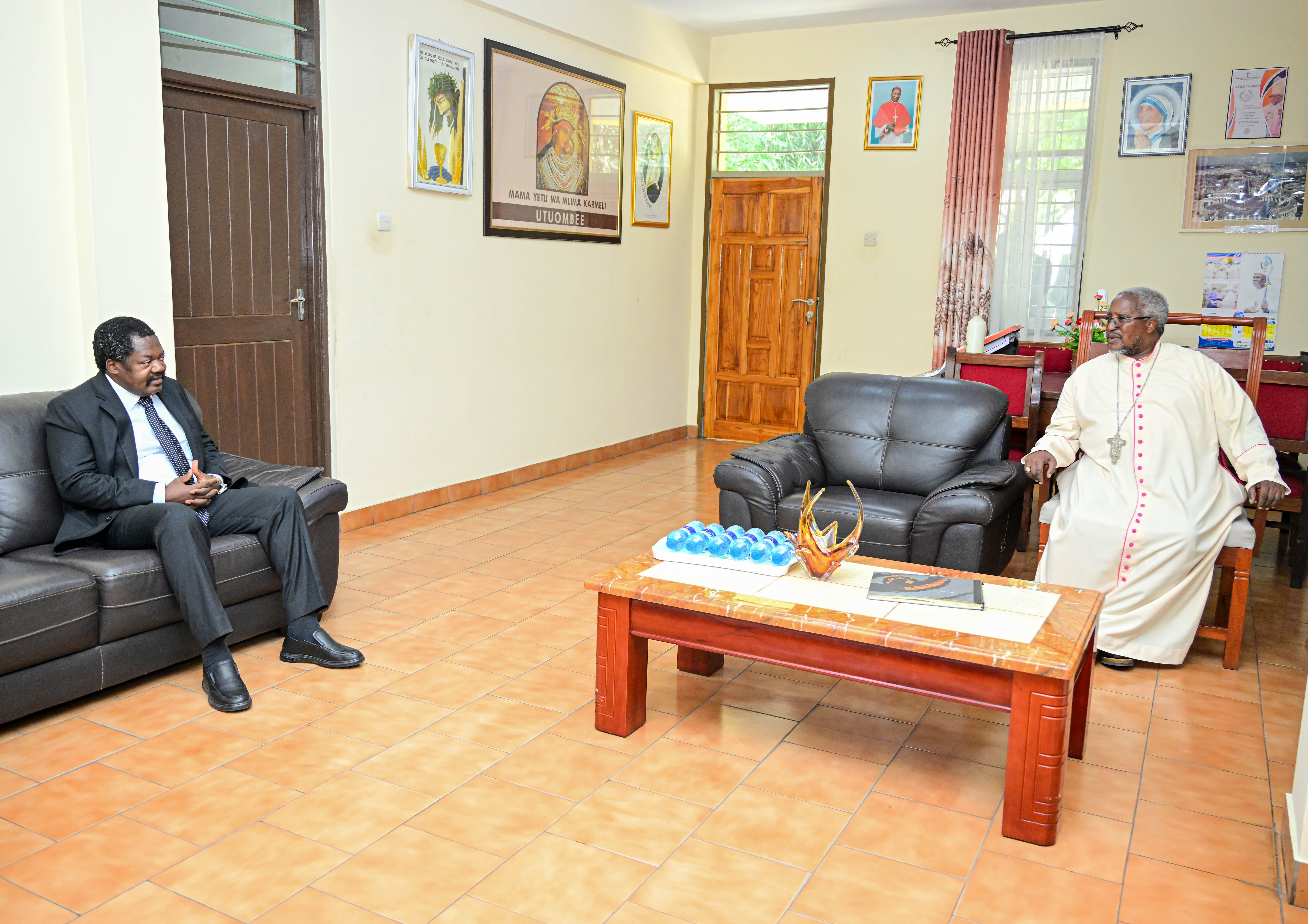 Makamu wa Rais wa Jamhuri ya Muungano wa Tanzania Mhe.Balozi Dkt. Emmanuel Nchimbi akizungumza na Askofu Mkuu wa Jimbo Kuu Katoliki Dar es Salaam, Mhashamu Askofu Yude Thaddeus Ruwa’ich (OFM Cap) wakati alipowasili makazi ya Kiaskofu ya Jimbo Kuu Katoliki Dar es Salaam, Kurasini, kuwasilisha salamu za rambirambi za Rais wa Jamhuri ya Muungano wa Tanzania Mhe. Dkt. Samia Suluhu Hassan kufuatia kifo cha Askofu Mkuu Mstaafu wa Jimbo Kuu Katoliki Dar es Salaam, Mwadhama Polycarp Kardinali Pengo.