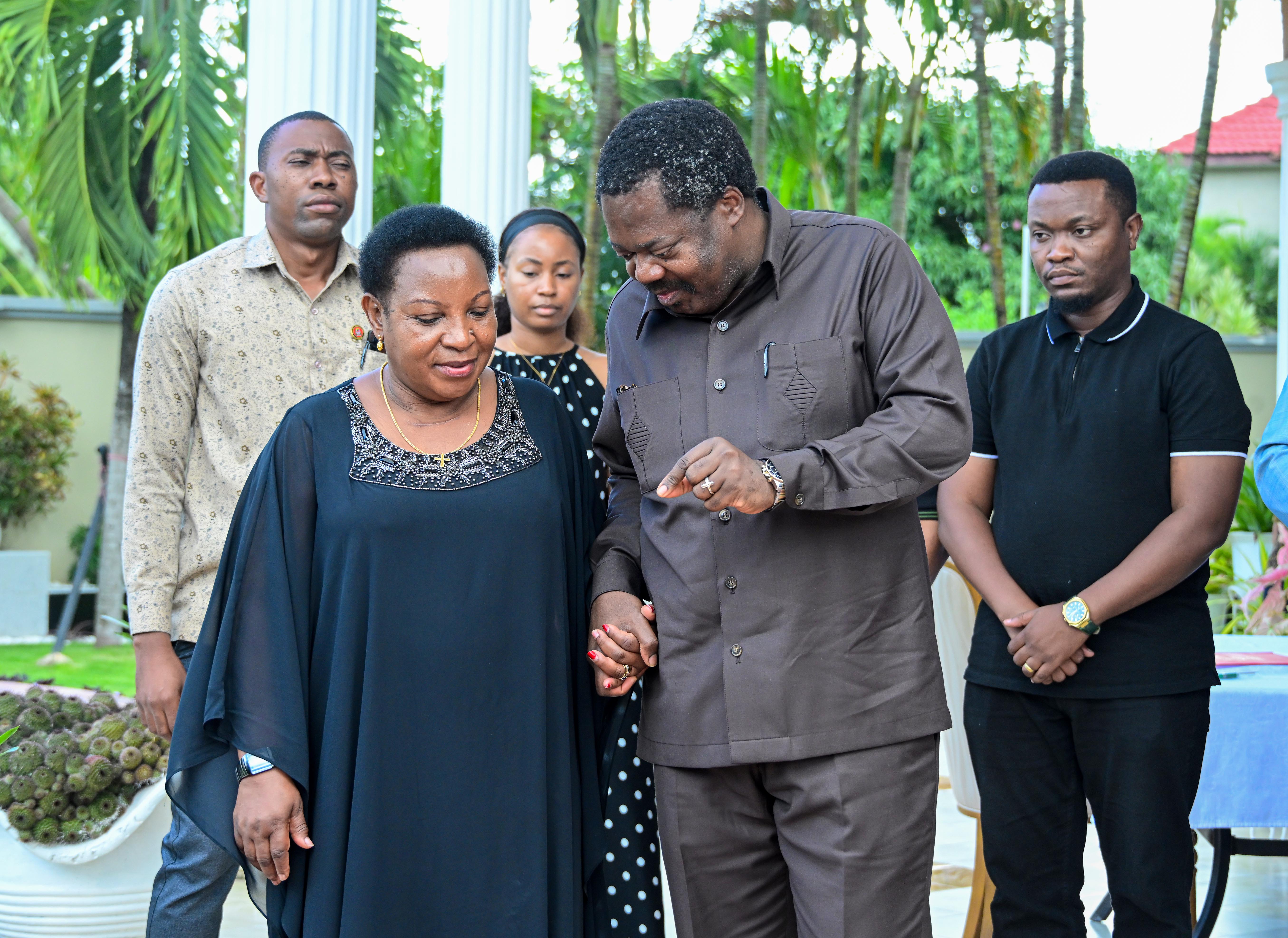 Makamu wa Rais wa Jamhuri ya Muungano wa Tanzania Mhe. Balozi Dkt. Emmanuel Nchimbi akizungumza jambo na Bi. Germina Lukuvi ambaye ni mjane wa aliyekuwa Waziri wa Nchi, Ofisi ya Waziri Mkuu, Sera, Bunge, Uratibu na Wenye Ulemavu, Marehemu William Vangimembe Lukuvi, wakati alipoitembelea na kuifariji familia hiyo katika mkazi yao Mbezi Beach Jijini Dar es Salaam, leo tarehe 16 Aprili 2026. Wakati wa Msiba na Mazishi ya Kiongozi huyo, Makamu wa Rais alikuwa nje ya nchi kwa ziara ya kikazi.