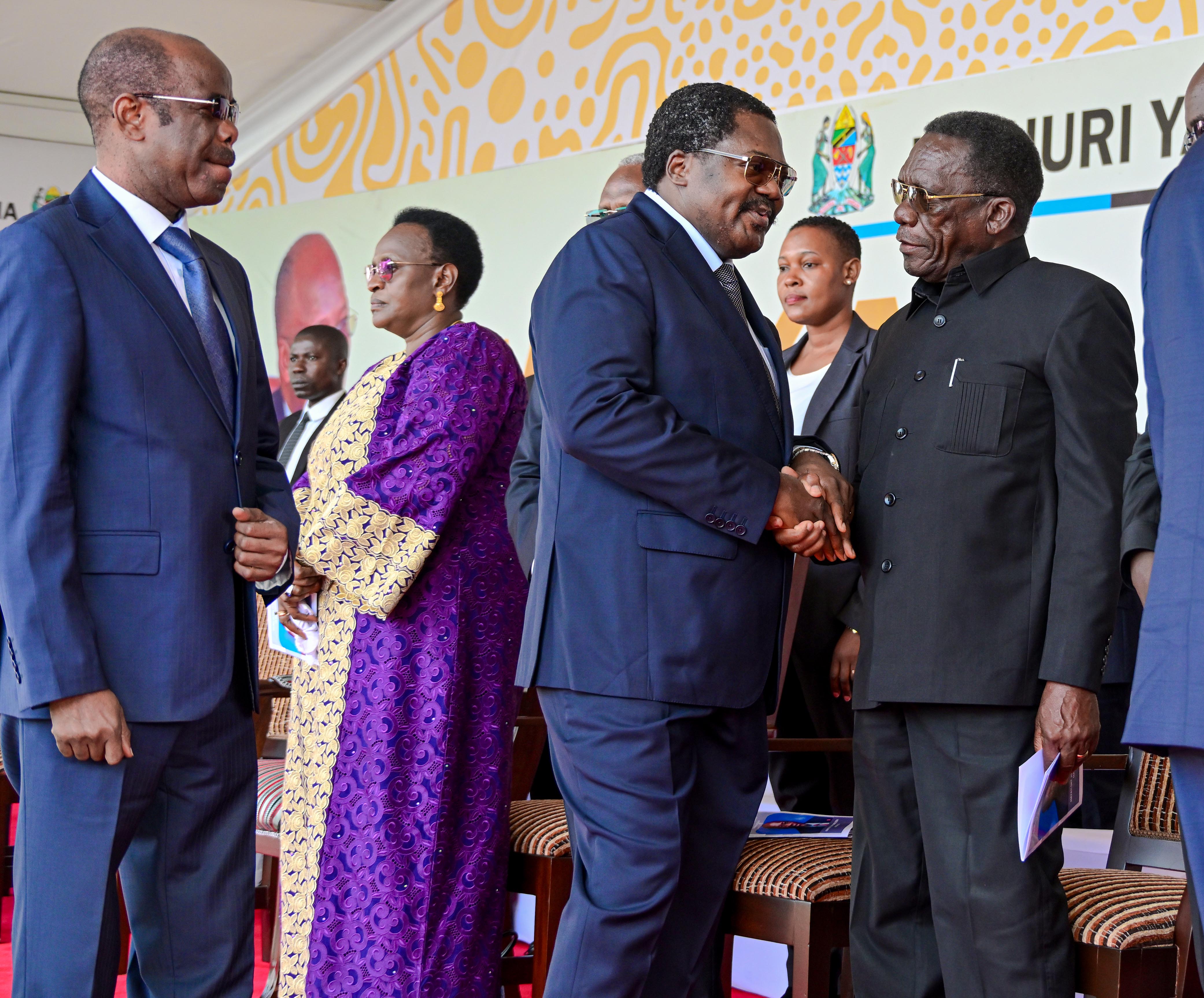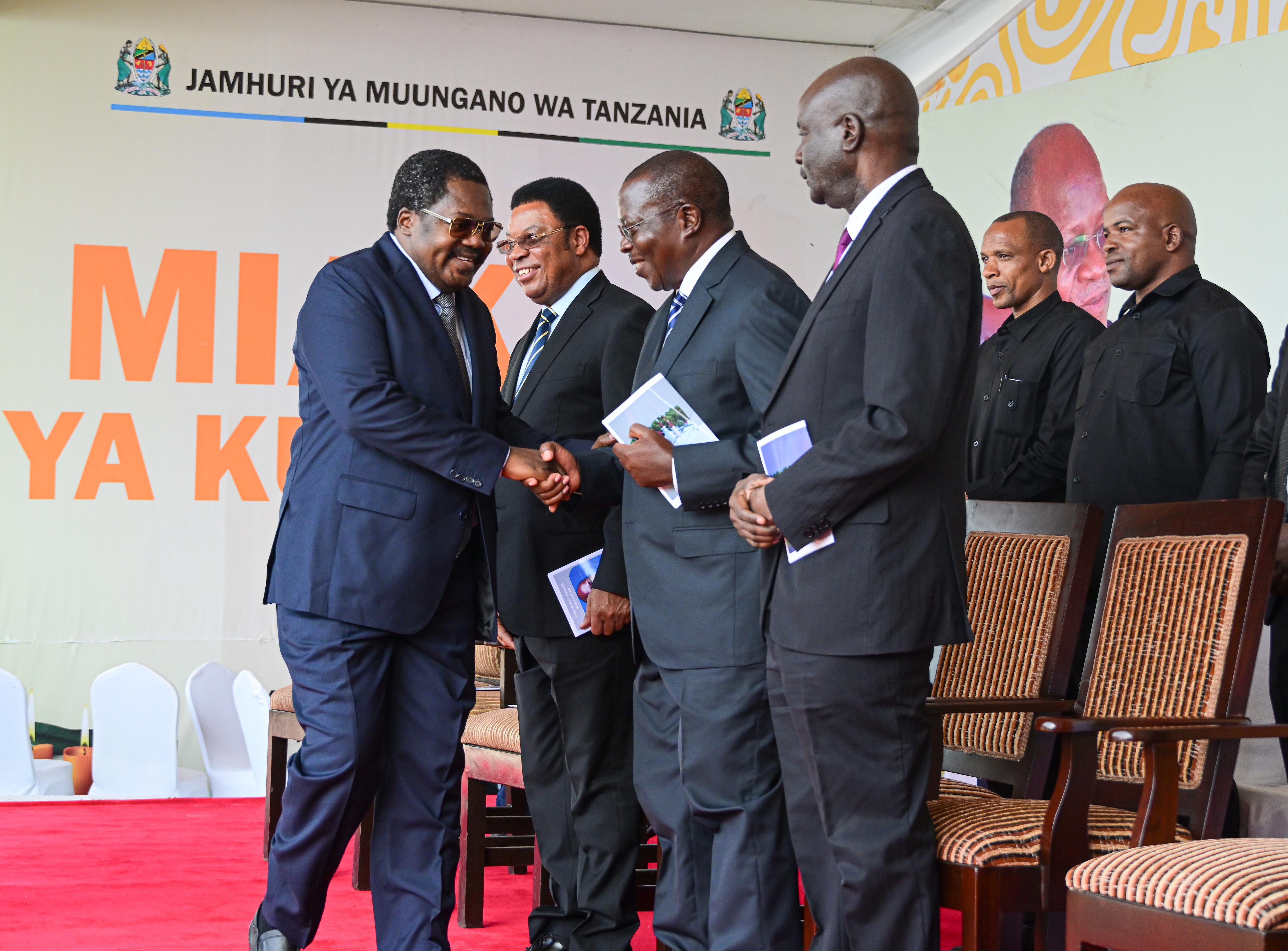 Makamu wa Rais wa Jamhuri ya Muungano wa Tanzania Mhe.Balozi Dkt. Emmanuel Nchimbi akisalimiana na Makamu wa Rais wa Jamhuri ya Muungano wa Tanzania Mstaafu Mhe. Dkt. Philip Mpango wakati wa Adhimisho la Misa Takatifu ya Kumbukizi ya Miaka Mitano ya Kifo cha Rais wa Awamu ya Tano wa Jamhuri ya Muungano wa Tanzania Hayati Dkt. John Pombe Magufuli, inayofanyika Chato mkoani Geita, leo tarehe 17 Machi 2026. Wa pili kushoto ni Waziri Mkuu Mstaafu Mhe. Kassim Majaliwa.