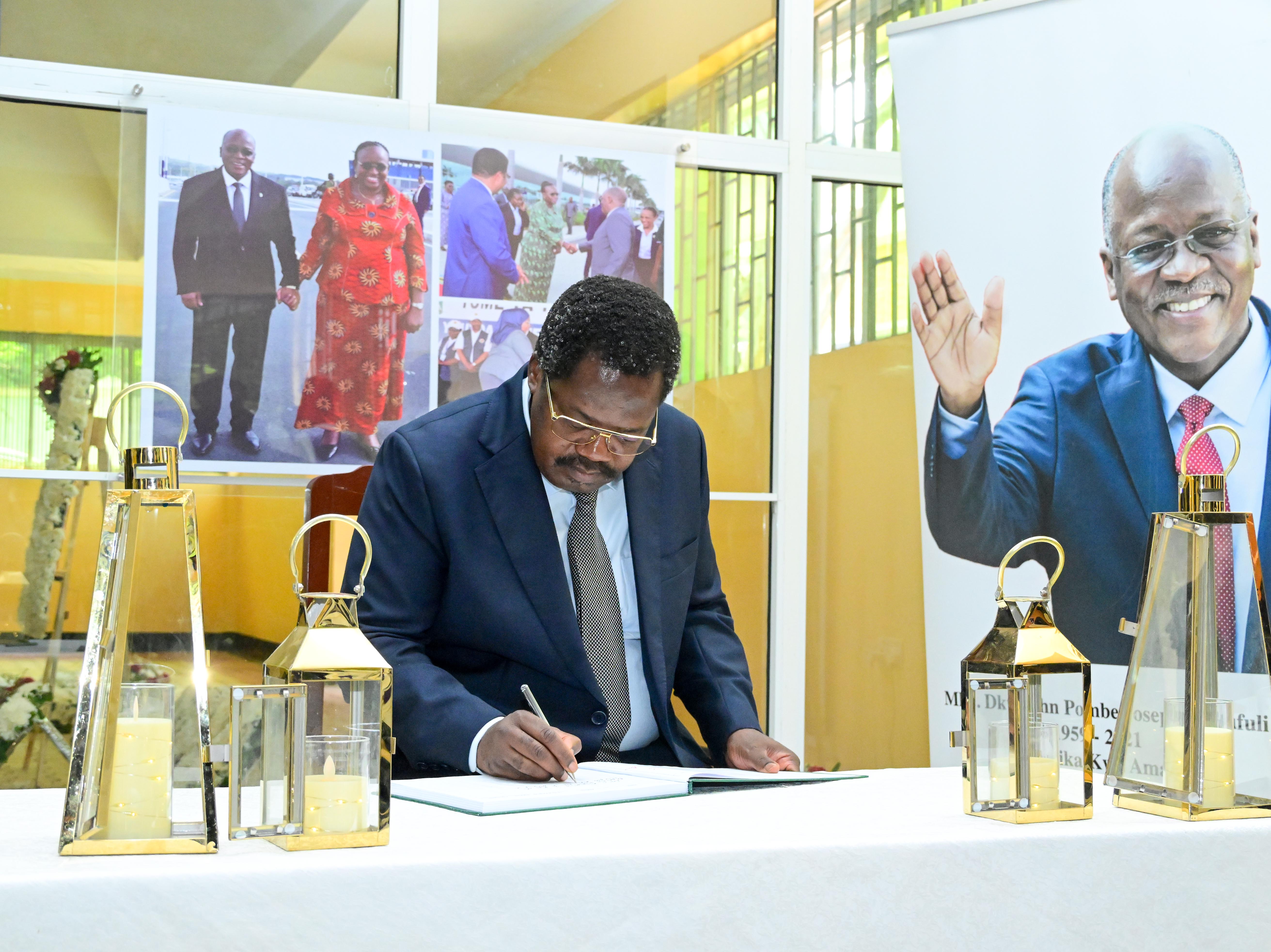 Makamu wa Rais wa Jamhuri ya Muungano wa Tanzania Mhe.Balozi Dkt. Emmanuel Nchimbi akiweka saini kitabu cha maombolezo katika kaburi la aliyekuwa Rais wa Awamu ya Tano wa Jamhuri ya Muungano wa Tanzania Hayati Dkt. John Pombe Magufuli, mara baada ya kushiriki Kumbukizi ya Miaka Mitano ya Kifo cha Hayati Magufuli, iliyofanyika Chato mkoani Geita, leo tarehe 17 Machi 2026.