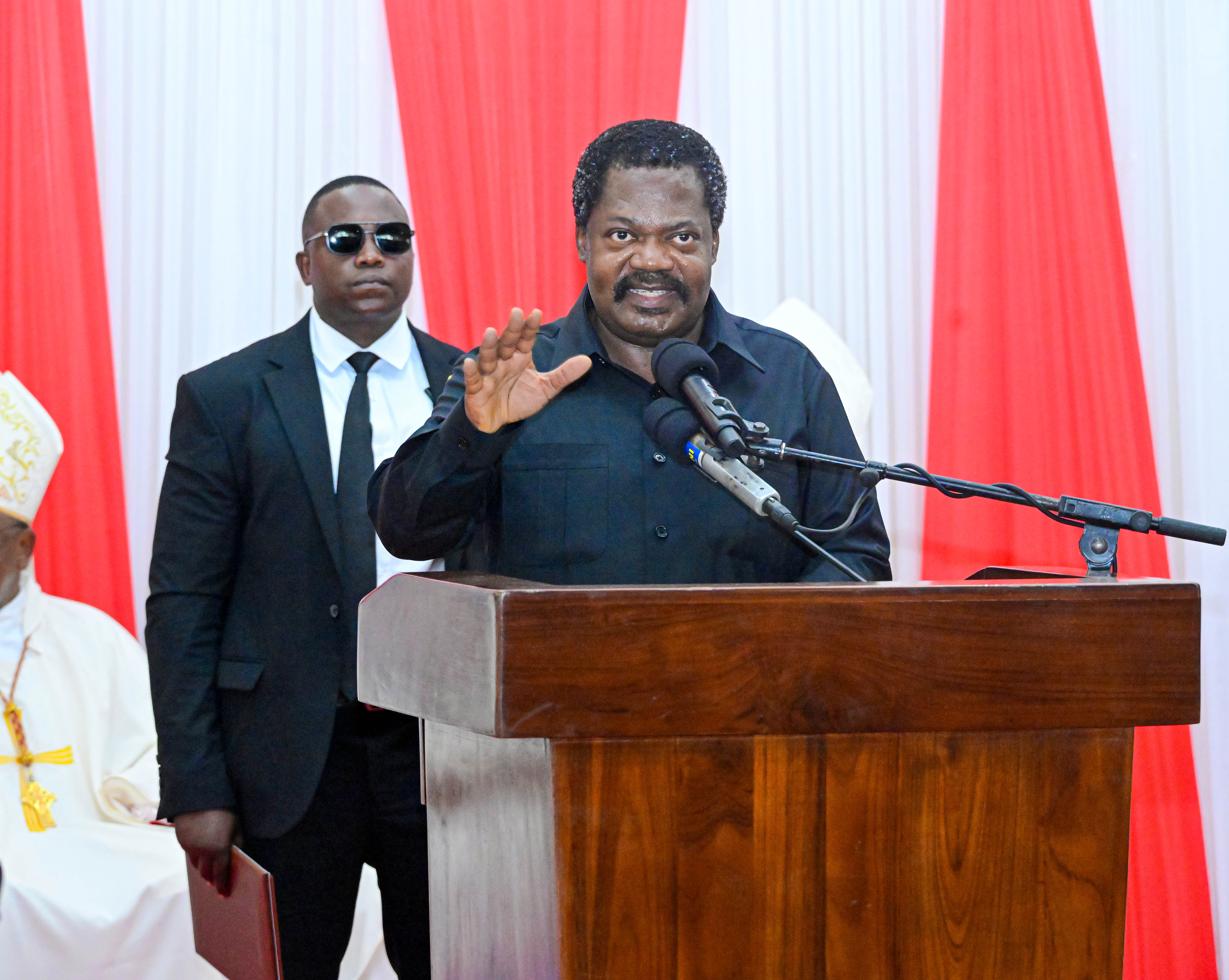 Makamu wa Rais wa Jamhuri ya Muungano wa Tanzania Mhe.Balozi Dkt. Emmanuel Nchimbi akitoa salamu za rambirambi kwa niaba ya Rais wa Jamhuri ya Muungano wa Tanzania Mhe. Dkt. Samia Suluhu Hassan, mara baada ya Adhimisho la Misa Takatifu ya Mazishi ya Askofu Mkuu Mstaafu wa Jimbo Kuu Katoliki Dar es Salaam, Marehemu Mwadhama Polycarp Kardinali Pengo iliyofanyika, katika Kanisa la Hija ya Bikira Maria - Pugu Jijini Dar es Salaam, leo tarehe 28 Februari 2026.