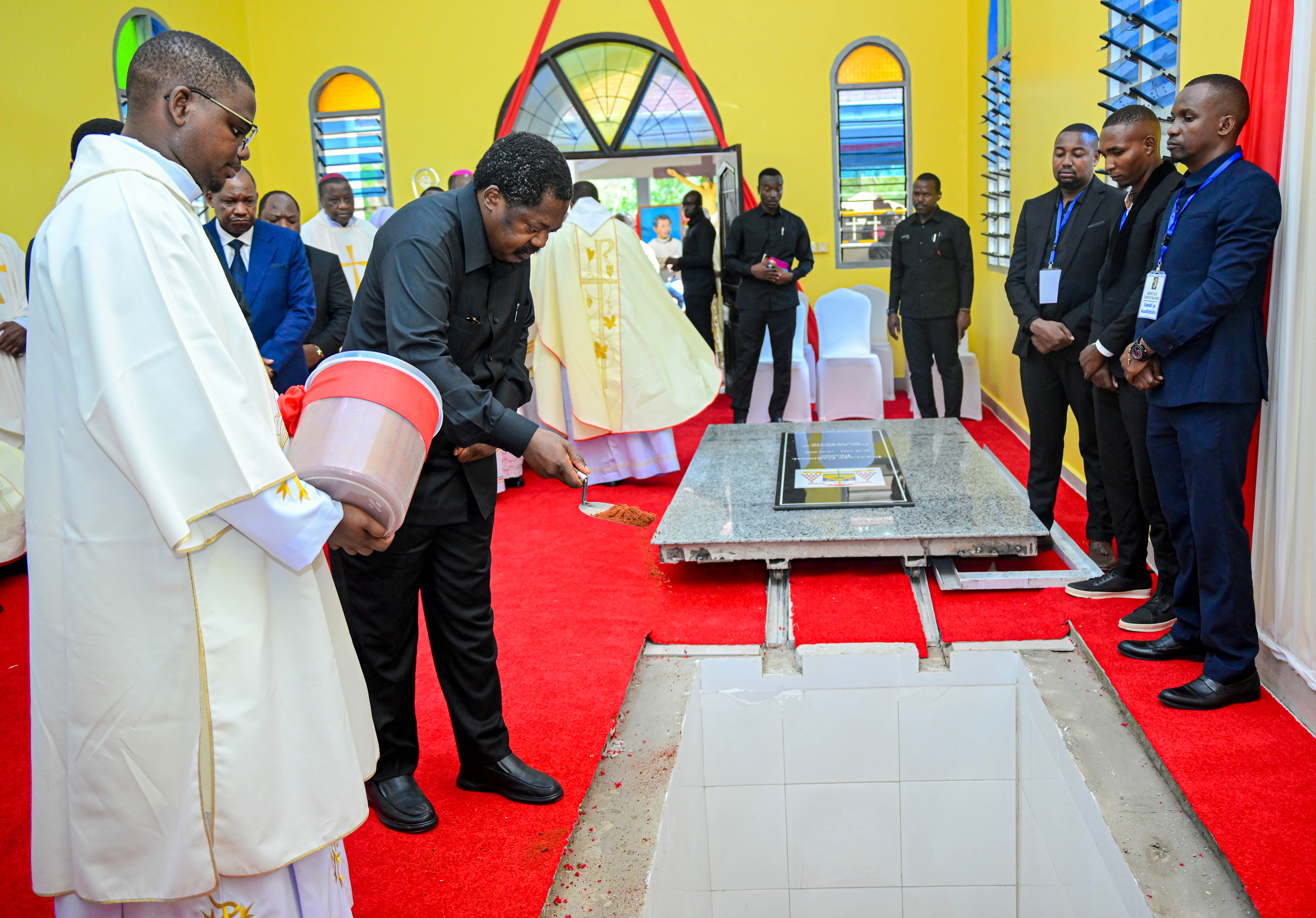 Makamu wa Rais wa Jamhuri ya Muungano wa Tanzania Mhe.Balozi Dkt. Emmanuel Nchimbi akiwa na Waziri Mkuu wa Jamhuri ya Muungano wa Tanzania Mhe. Dkt. Mwigulu Nchemba, Viongozi mbalimbali wa Serikali pamoja na Viongozi wa Kanisa Katoliki, wakishuhudia mwili wa aliyekua Askofu Mkuu Mstaafu wa Jimbo Kuu Katoliki Dar es Salaam, Marehemu Mwadhama Polycarp Kardinali Pengo, ukiteremshwa kaburini, wakati wa mazishi yaliyofanyika katika Kituo cha Hija – Pugu Jijini Dar es Salaam, leo tarehe 28 Februari 2026.