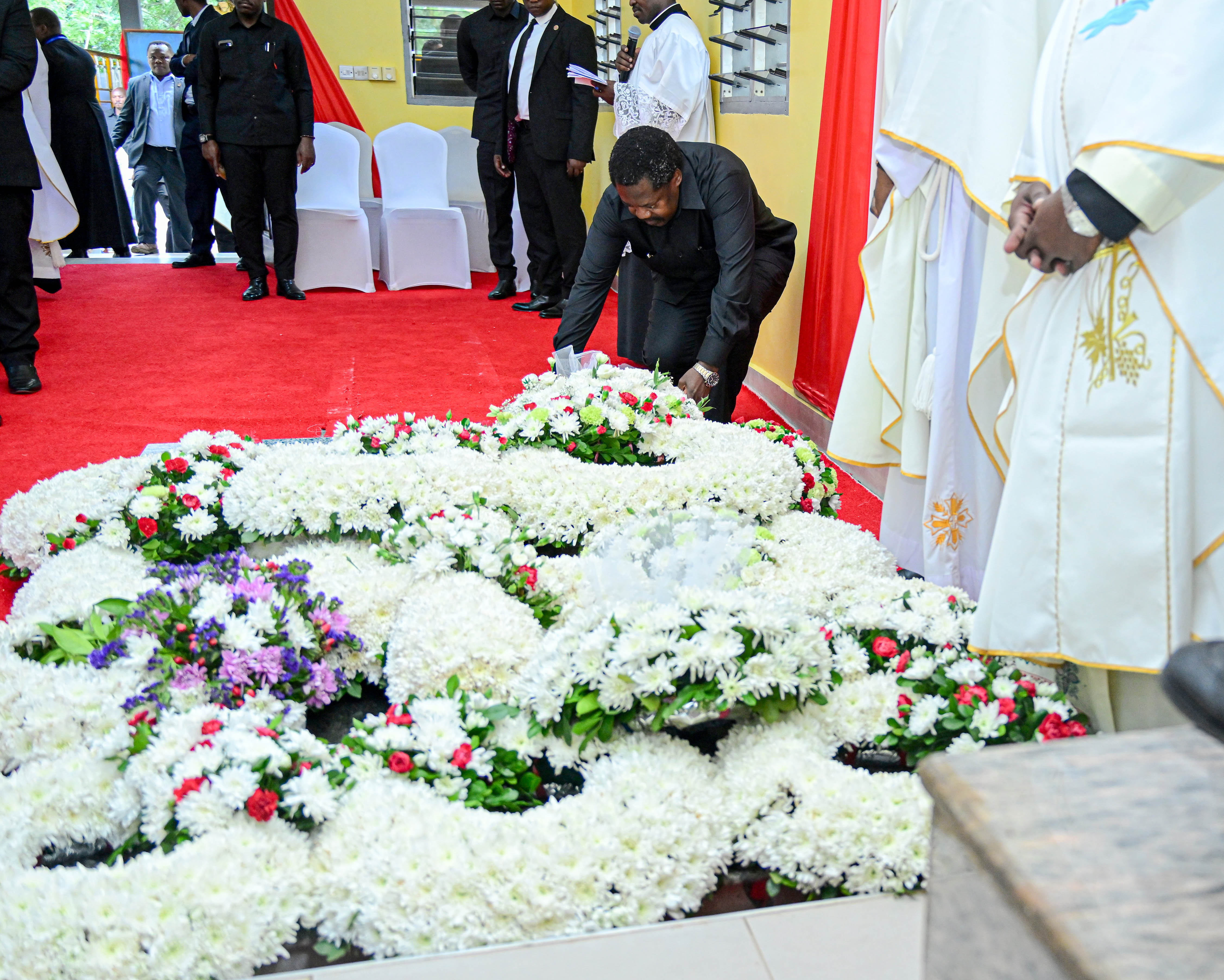 Makamu wa Rais wa Jamhuri ya Muungano wa Tanzania Mhe.Balozi Dkt. Emmanuel Nchimbi akiweka shada la maua katika kaburi la aliyekua Askofu Mkuu Mstaafu wa Jimbo Kuu Katoliki Dar es Salaam, Marehemu Mwadhama Polycarp Kardinali Pengo, wakati wa mazishi yaliyofanyika katika Kituo cha Hija – Pugu Jijini Dar es Salaam, leo tarehe 28 Februari 2026.