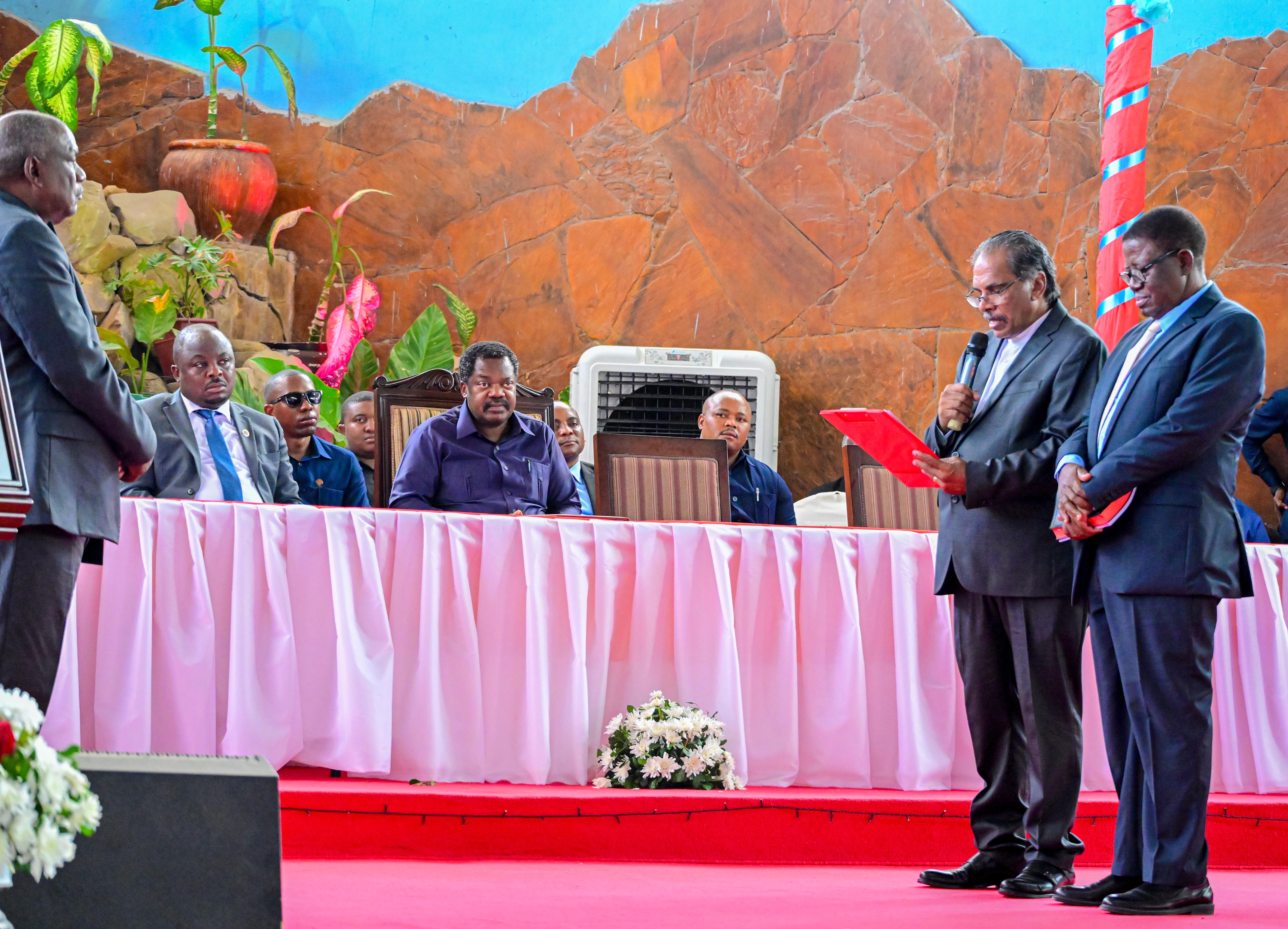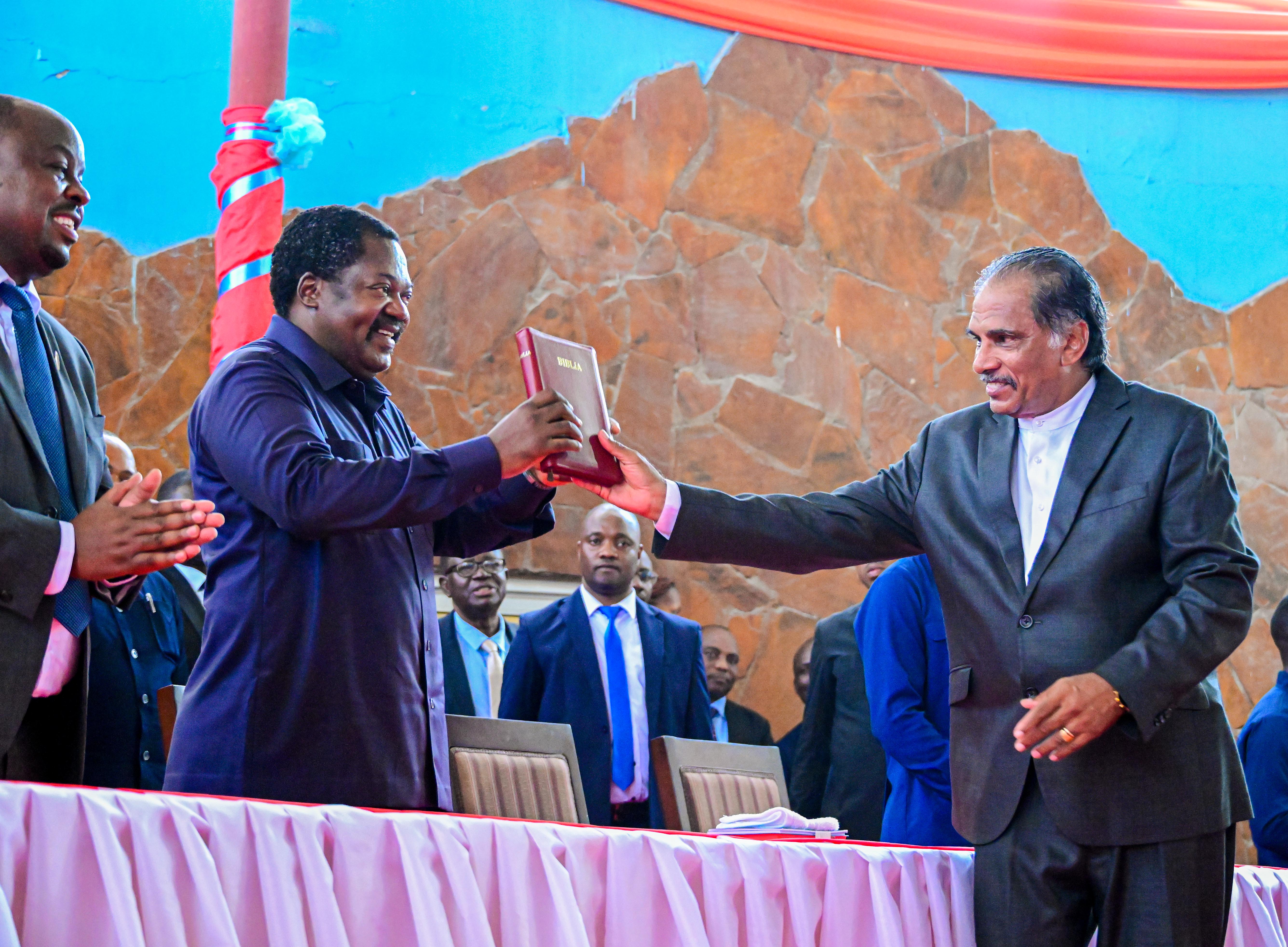 Makamu wa Rais wa Jamhuri ya Muungano wa Tanzania Mhe.Balozi Dkt. Emmanuel Nchimbi akishuhudia kuapishwa kwa Mwenyekiti Mpya wa Baraza la Makanisa ya Kipentekoste Tanzania (CPTC), Askofu Dkt. Vernon Fernandes, wakati wa hafla ya kusimikwa Uongozi wa Kitaifa wa Awamu ya Tano wa Baraza la Makanisa ya Kipentekoste Tanzania (CPTC), iliyofanyika katika Ukumbi wa Agape Life Church, uliopo Mbezi Jogoo, Jijini Dar es Salaam leo tarehe 06 Februari 2026.