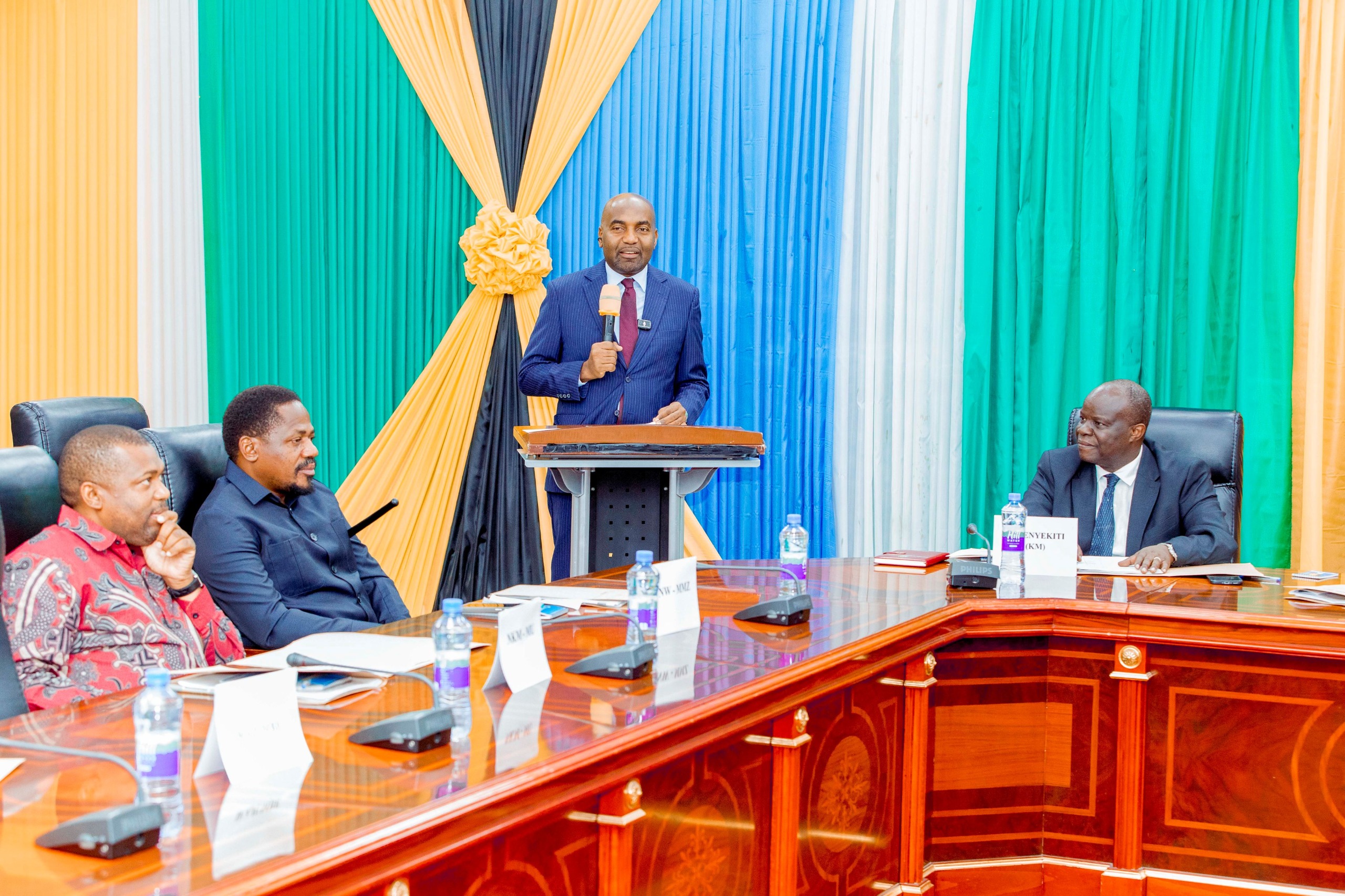 Waziri wa Nchi, Ofisi ya Makamu wa Rais Mhe. Mhandisi Hamad Yussuf Masauni akifungua Mkutano wa Baraza la Wafanyakazi Ofisi ya Makamu wa Rais uliofanyika Dodoma, Aprili 15, 2026. Wa pili kutoka kushoto ni Naibu Waziri Ofisi ya Makamu wa Rais, Mhe. Reuben Kwagilwa, wa Kwanza kulia Katibu Mkuu Ofisi ya Makamu wa Rais Dkt. Richard Muyungi na wa kwanza kushoto ni Naibu Katibu Mkuu (Muungano) Bw. Abdallah Mitawi.