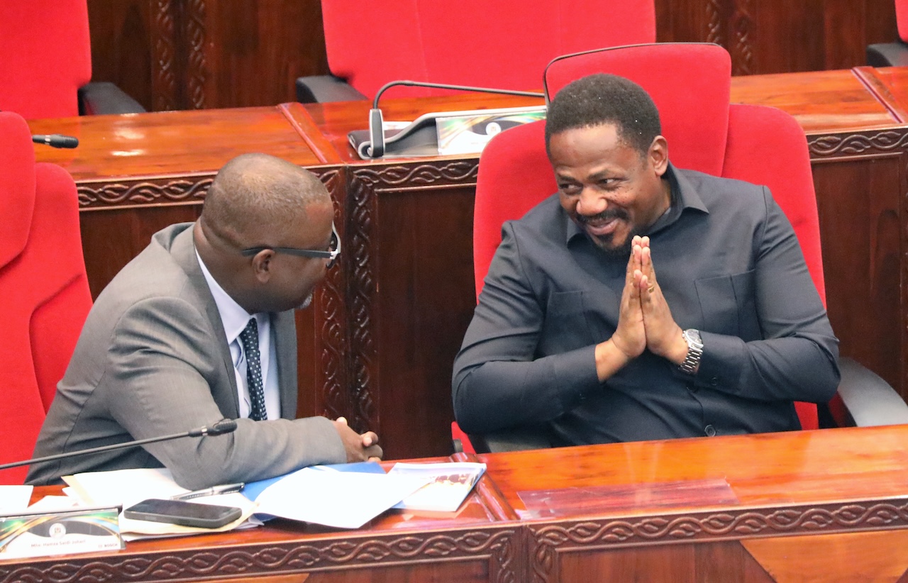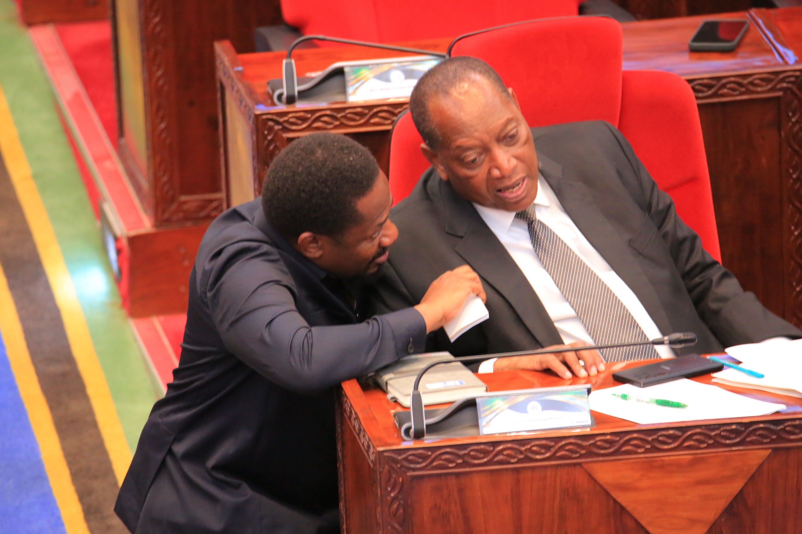 Waziri wa Nchi Ofisi ya Waziri Mkuu (Sera, Bunge, uratibu na Wenye Ulemavu) Mhe. Prof. Palamagamba Kabudi akimsikiliza Naibu Waziri Ofisi ya Makamu wa Rais (Muungano na Mazingira) Mhe. Reuben Kwagilwa wakati wa Kikao cha Tisa cha Mkutano wa Tatu Bunge la 13 jijini Dodoma leo Aprili 15, 2026.