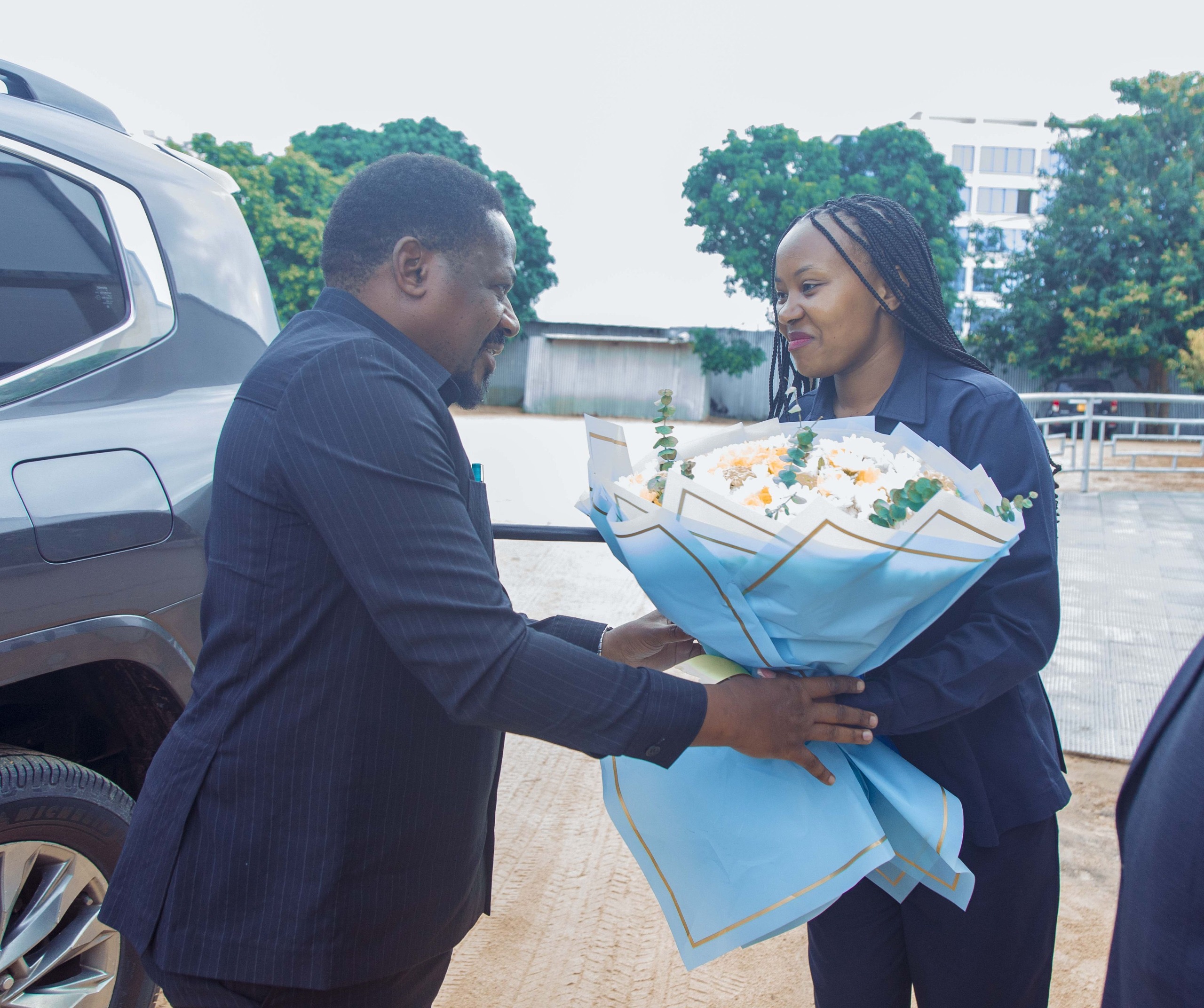 Naibu Waziri, Ofisi ya Makamu wa Rais (Muungano na Mazingira), Mhe. Reuben Kwagilwa, akipokea ua mara baada ya kuwasili Ofisi ya Makamu wa Rais zilizopo, Mji wa Serikali Mtumba, jijini Dodoma, Aprili 9, 2026.