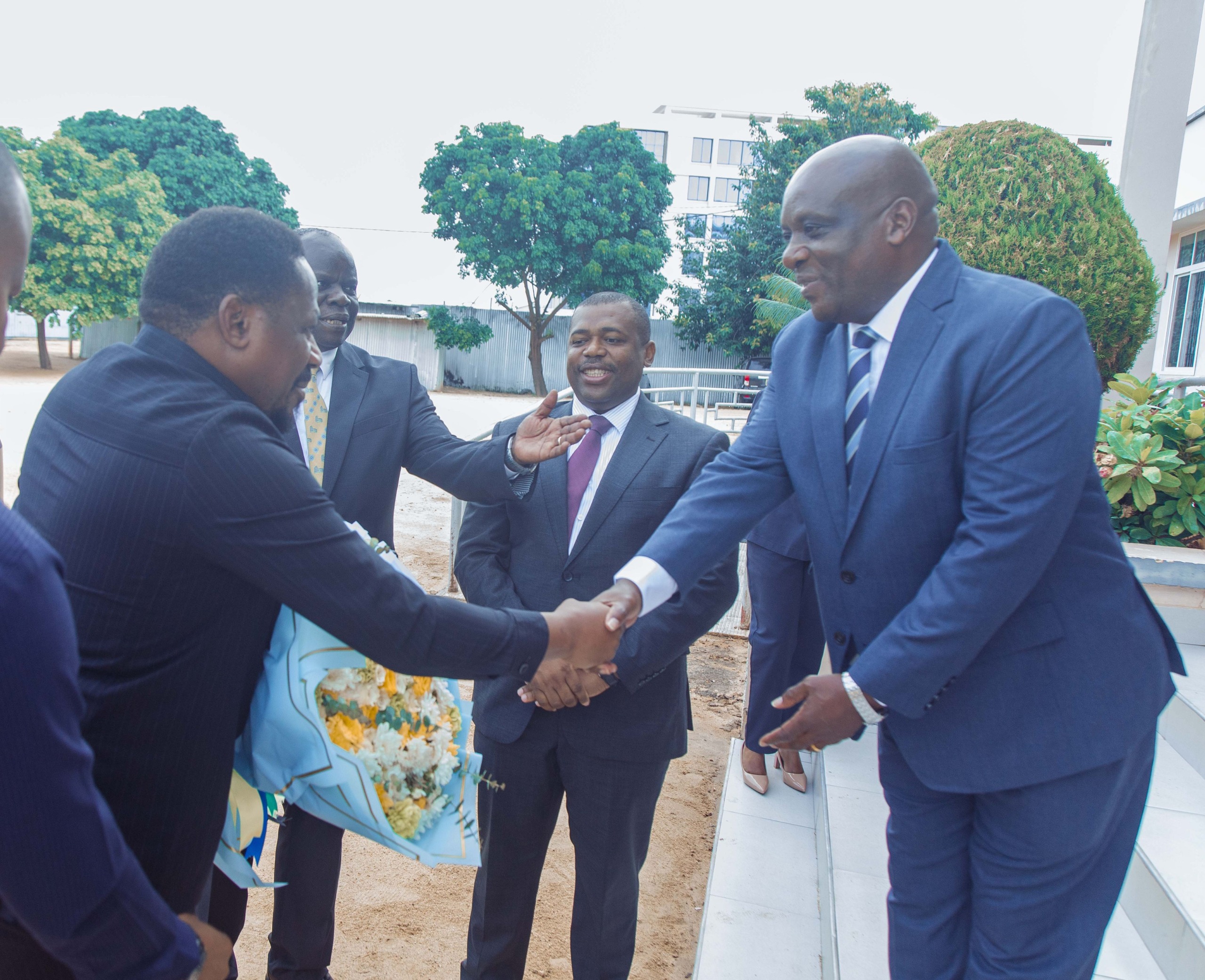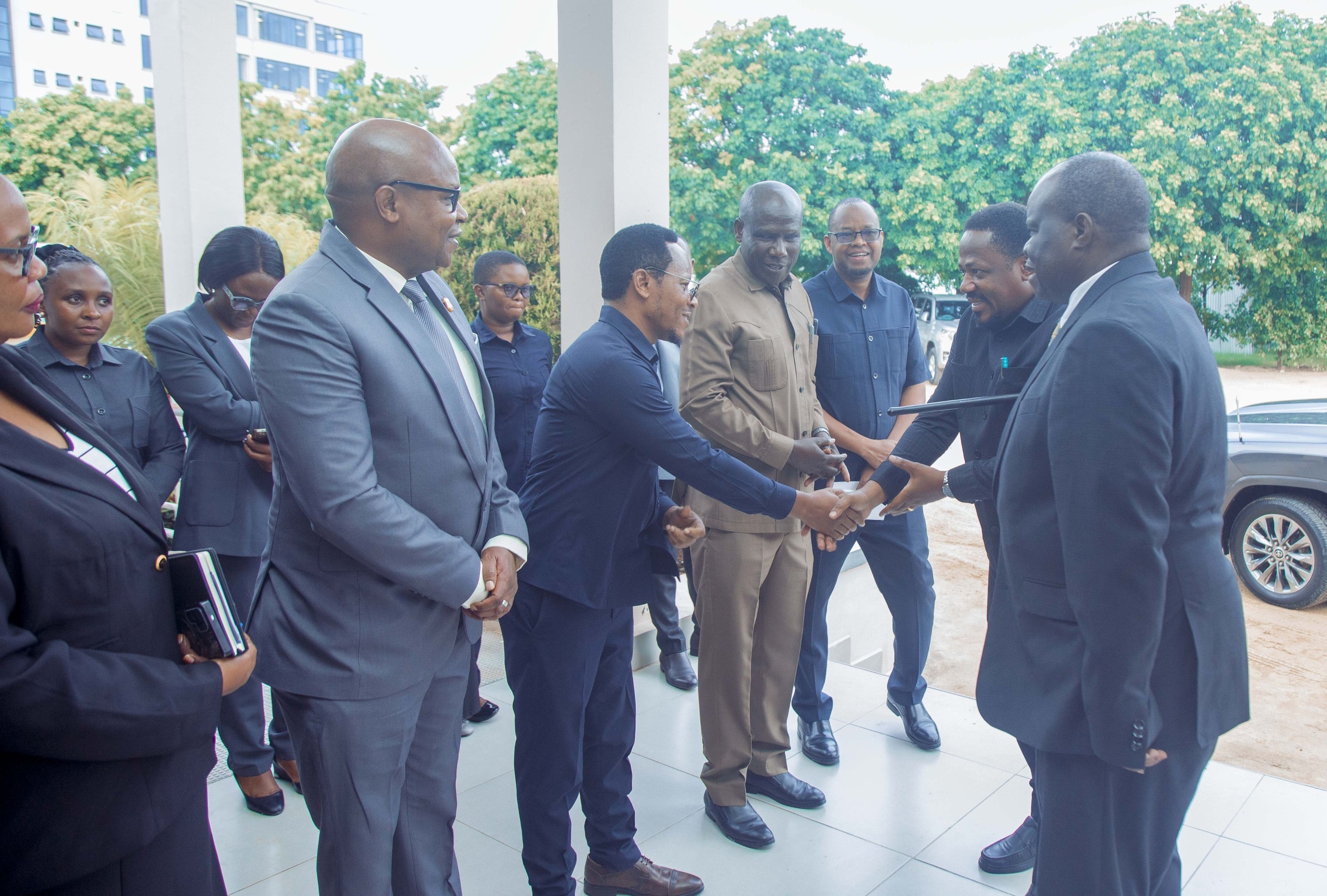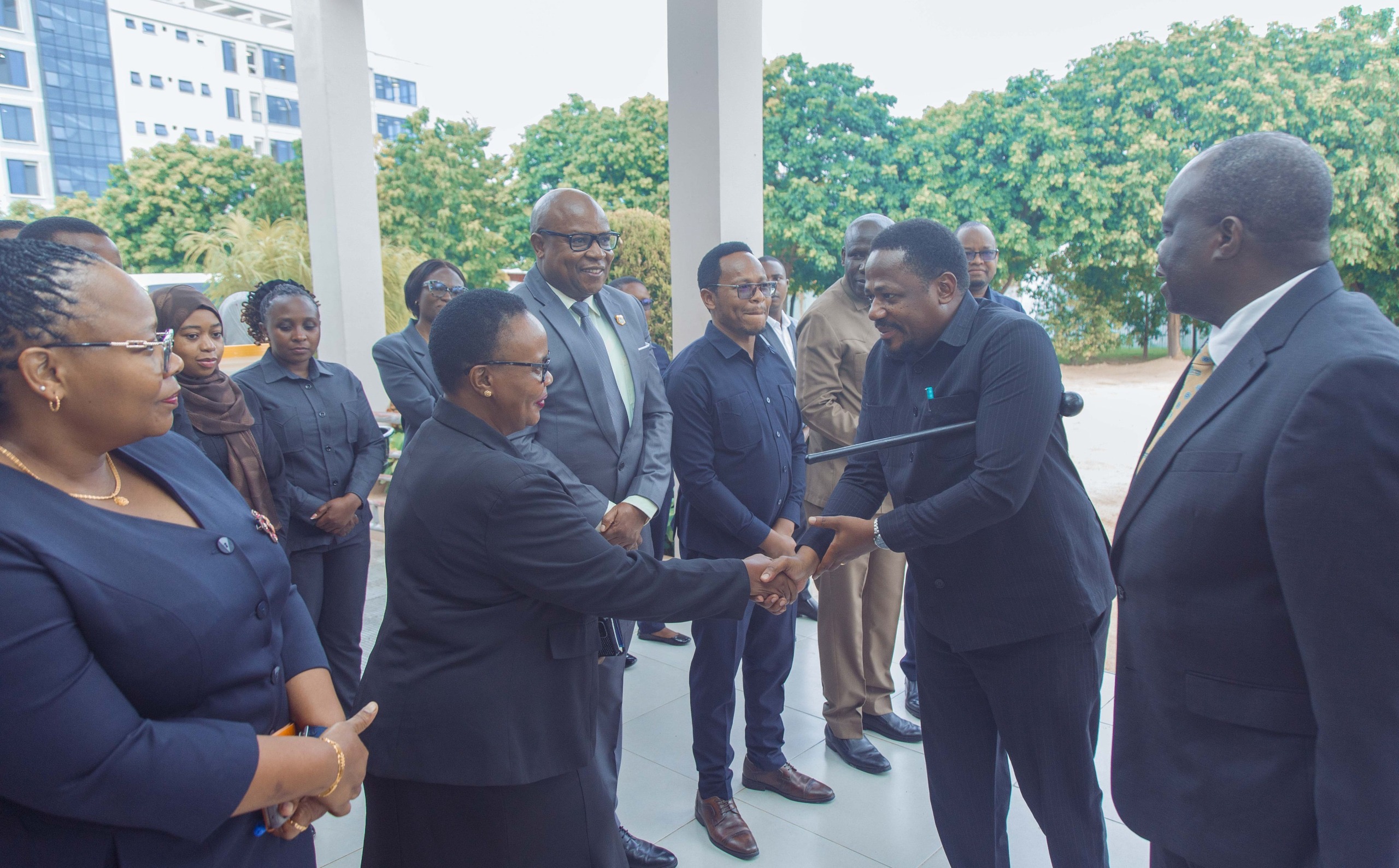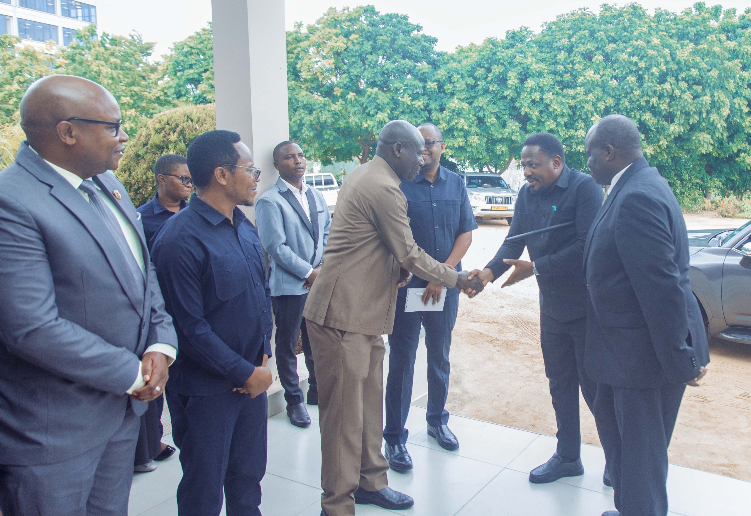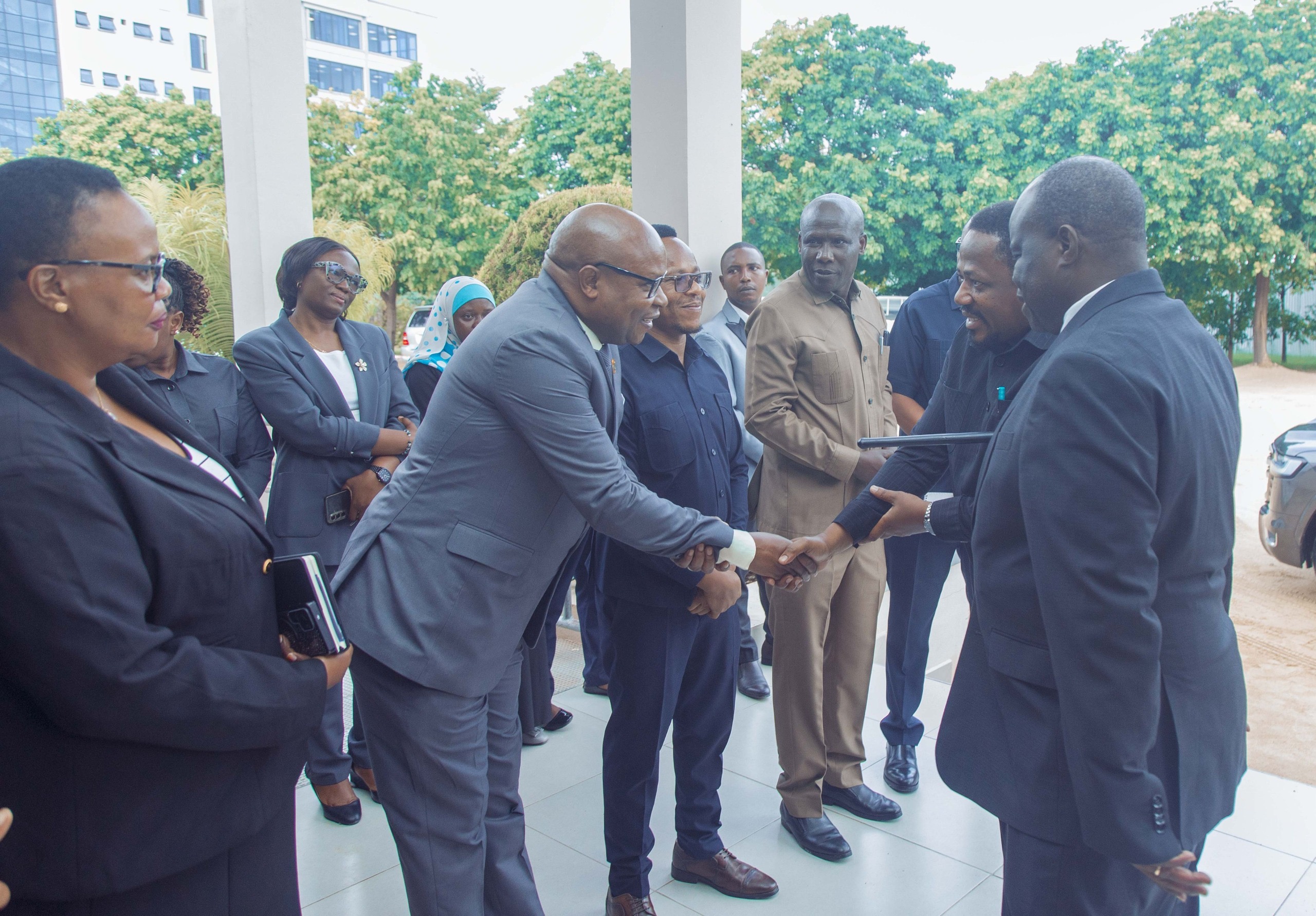 Naibu Waziri, Ofisi ya Makamu wa Rais (Muungano na Mazingira), Mhe. Reuben Kwagilwa, akisalimiana na baadhi ya viongozi mbalimbali wa Menejimenti ya Ofisi ya Makamu wa Rais mara baada ya kuwasili Ofisi hizo, Mji wa Serikali Mtumba, jijini Dodoma, Aprili 9, 2026.
