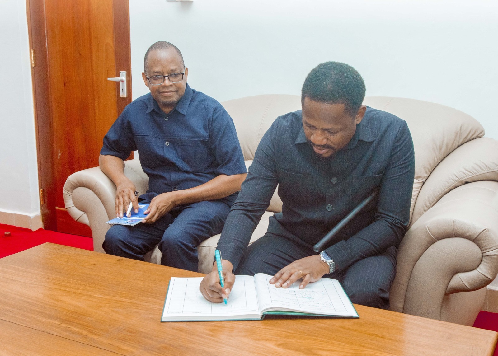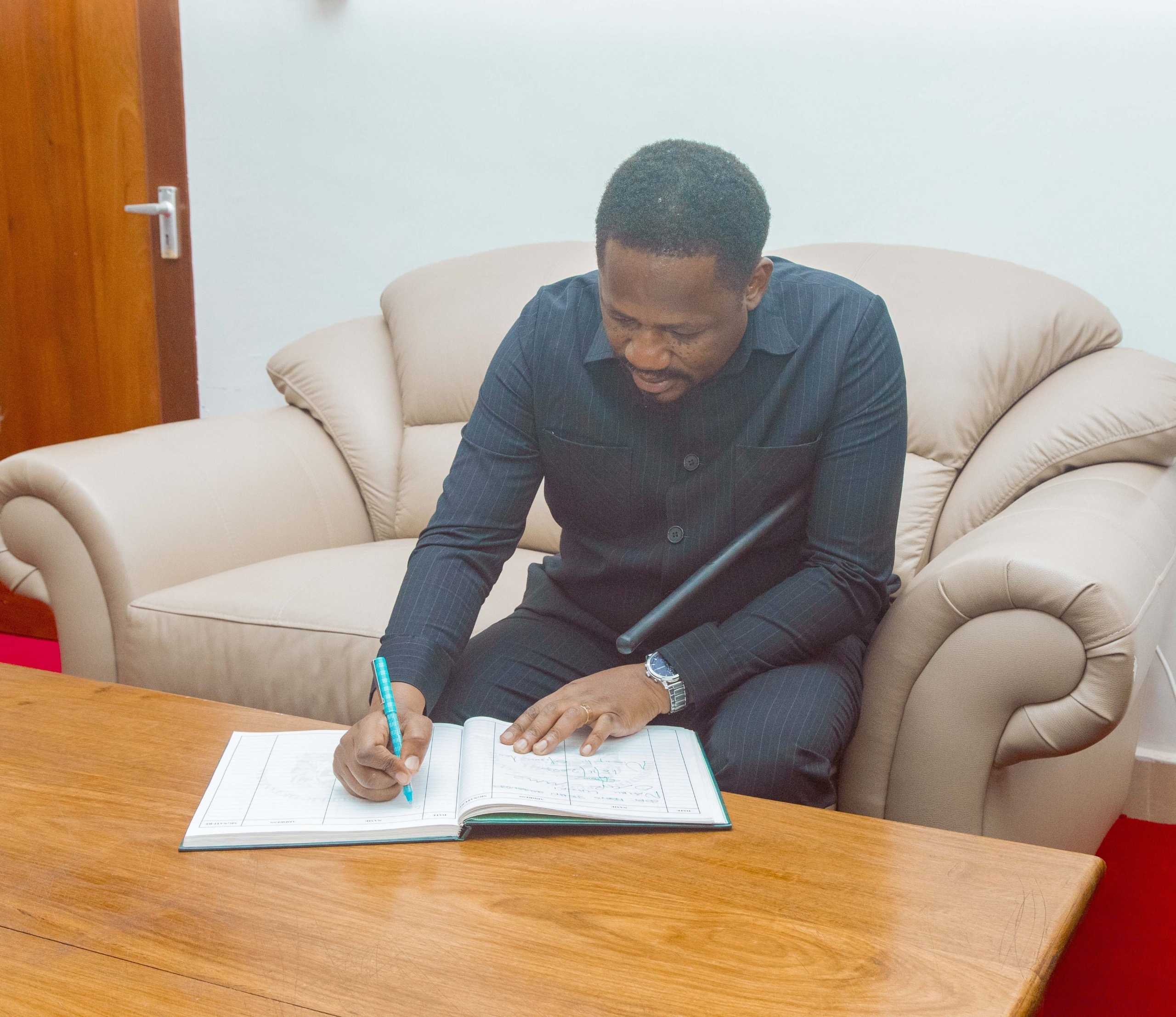 Naibu Waziri, Ofisi ya Makamu wa Rais (Muungano na Mazingira), Mhe. Reuben Kwagilwa, akisaini kitabu cha wageni mara baada ya kuwasili Ofisi ya Makamu wa Rais, Mji wa Serikali Mtumba, jijini Dodoma, Aprili 9, 2026.