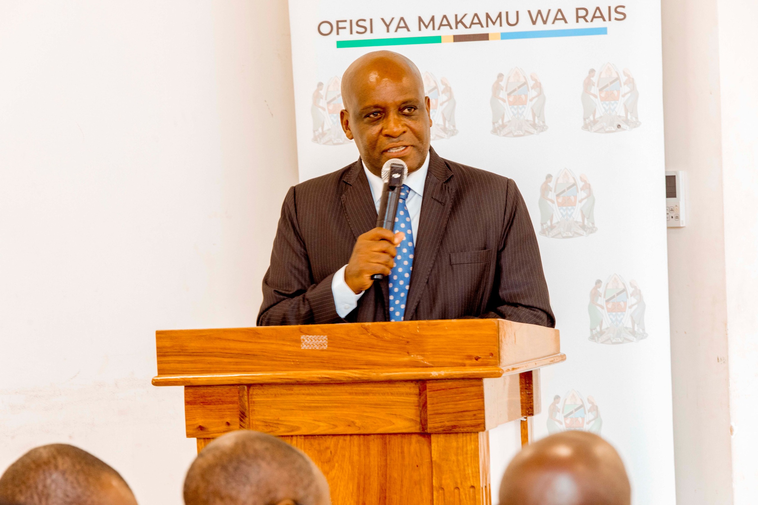 Naibu Katibu Mkuu (Mazingira), Ofisi ya Makamu wa Rais, Balozi Baraka Luvanda akizungumza wakati wa Kikao cha Makatibu Tawala wa Mikoa na Wakurugenzi wa Halmashauri kuhusu Programu ya Mageuzi ya Kimkakati ya Mazingira Endelevu Tanzania, kilichofanyika Dodoma, Aprili 16, 2026.