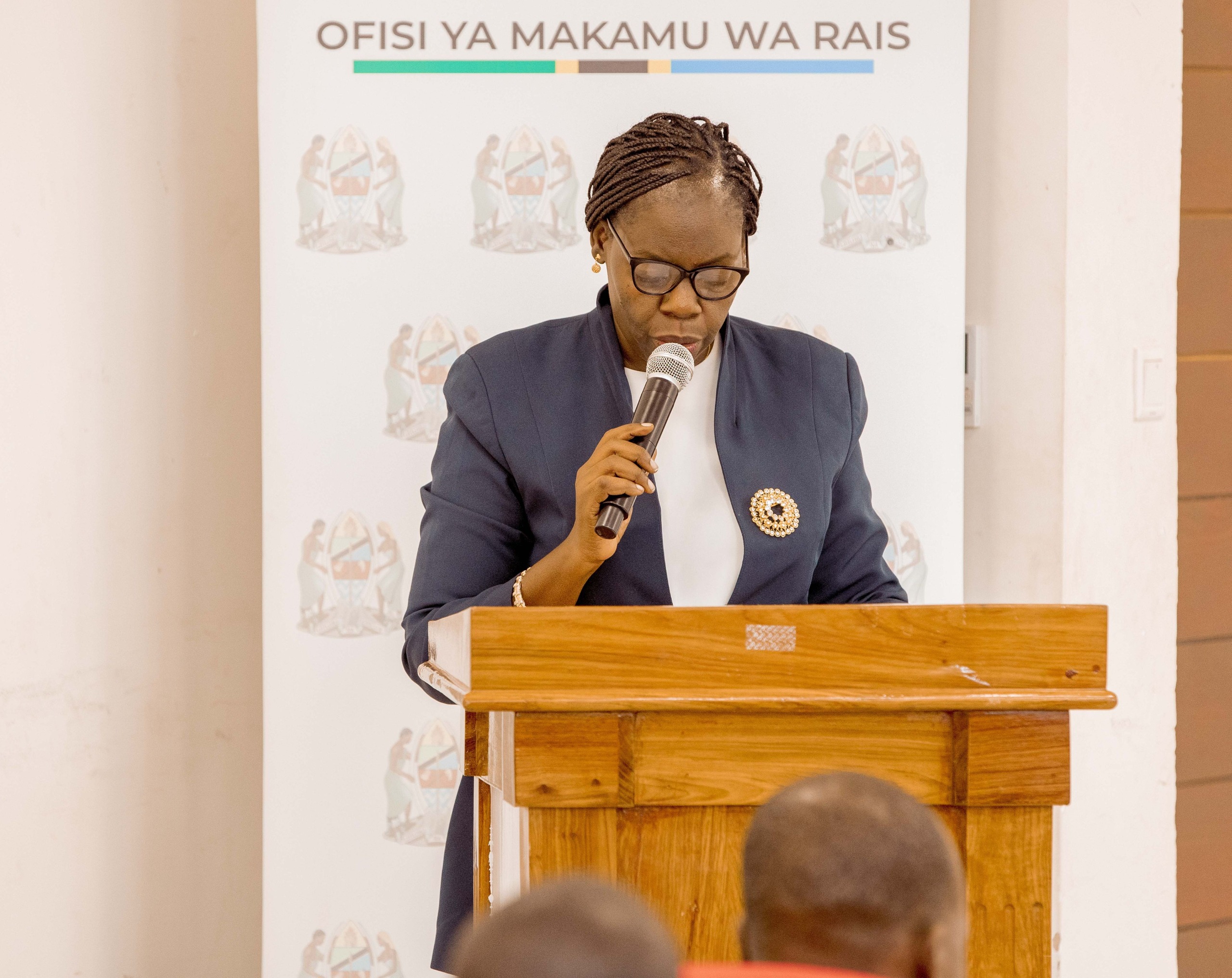 Mkurugenzi wa Mazingira Ofisi ya Makamu wa Rais Bi. Kemilembe Mutasa akizungumza wakati wa Kikao cha Makatibu Tawala wa Mikoa na Wakurugenzi wa Halmashauri kuhusu Programu ya Mageuzi ya Kimkakati ya Mazi ngira Endelevu Tanzania, kilichofanyika Dodoma, Aprili 16, 2026